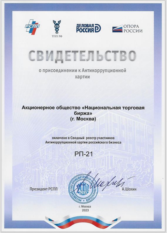 АО НТБ является участником Антикоррупционной хартии российского бизнеса и придерживается принципа неприятия коррупции в любых формах и проявлениях. В случае выявления коррупционного риска в процессе взаимодействия или выявления несоблюдения антикоррупционной политики АО НТБ, вы можете направить сообщение на электронный адрес: compliance-ntb@moex.com.